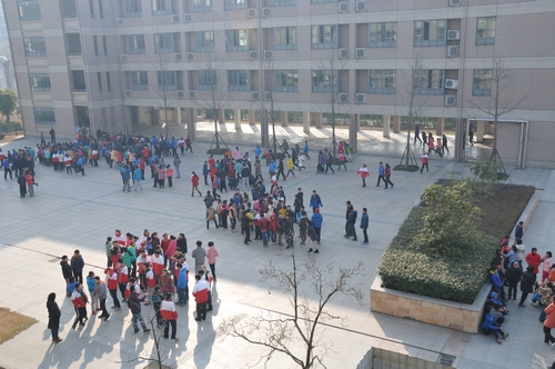 随着“疏散演习开始”一声令下,全校48个班级,两千多名学生在当堂老师和班主任的指挥下,按照应急预案制定的疏散路线,有序地撤离教室,疏散到安全地带。整个演习过程紧张而有序,安全而快速,用时不到两分钟,收到了预期效果。此次演习得到了大学保卫处的大力支持,他们选派干警守在各楼道出口处,确保学生的安全。