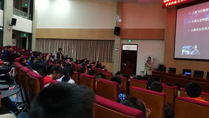 我们生活在哪里?在宇宙中处在什么位置?人类从哪里来,又将到哪里去?课堂一开始,汪毓明教授的这些问题就紧紧抓住了孩子们的心,这些看似平常而又深奥的问题带领着孩子们走进神秘的太空世界。汪教授告诉孩子们,正是在这一系列问题的驱动下,人类迈开了探测太空、探索未知的脚步。从两千多年前的极光和太阳黑子的神话,到伽利略开启现代科学的大门,再到人造卫星和飞船的发射,人类开启了太空探索的伟大历程,有离太阳最近的太阳探针,有离地球最远的旅行者号,有探索火星的机遇号,还有与土星融为一体的卡西尼飞船。在这过程中涌现出了一大批伟大的学者,他们在推动科学发展的同时也推动着技术的进步。