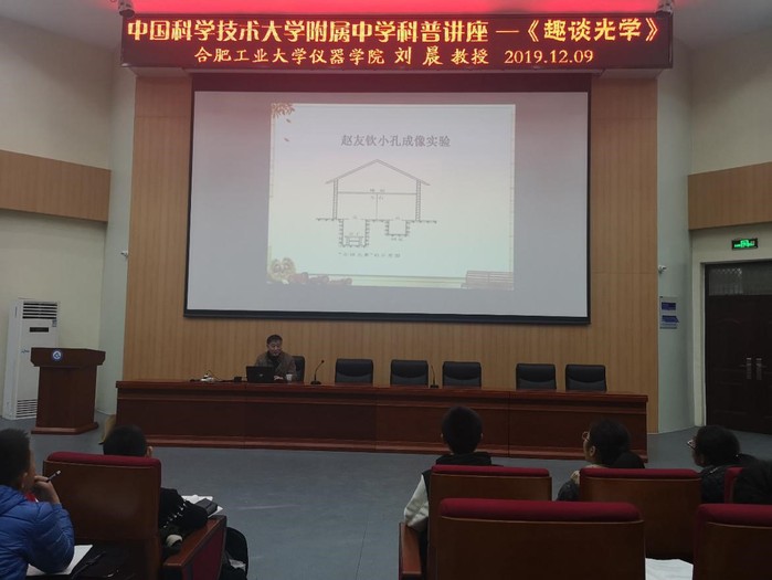 2019年12月9日下午5点,光学技术学科全国首席科学传播专家、合肥工业大学仪器学院刘晨博士走进科大附中,为七年级的同学带来《趣味光学》主题科普讲座。讲座由科学教师韦洁慧主持,七年级全体同学认真听取了讲座。
