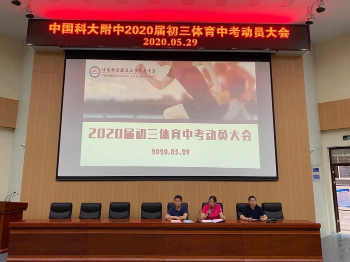 为了鼓舞考生士气,2020年5月29日下午,科大附中在报告厅召开初三体育中考动员会。校长助理黄严生、教务处副主任余国军、体育组组长王文华、年级组长吴燕燕与初三年级班主任参加会议,会议由余国军主持。动员会现场,老师胸有成竹,助燃斗志;学生“军容”整齐,士气昂扬。