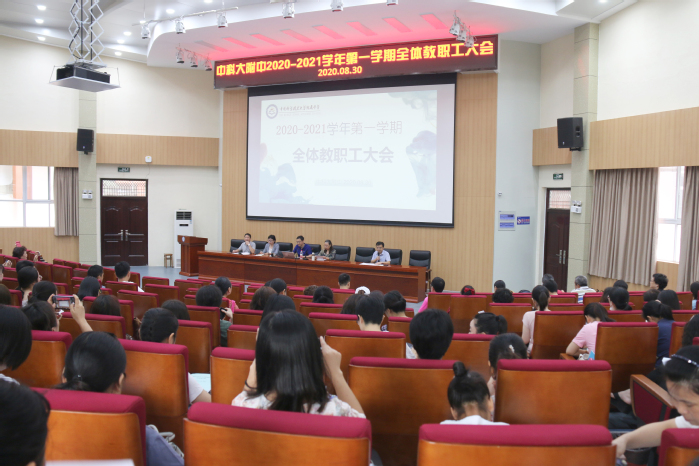 2020年8月30日上午,科大附中2020-2021学年第一学期全体教职工大会在报告厅召开。校长马运生,党总支书记李蓓,副校长张峻菡、徐斌,校长助理黄严生及全体教职工出席了会议。大会由徐斌主持。