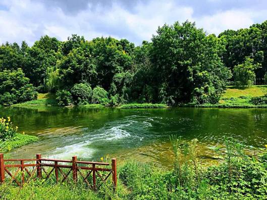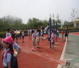 顺着地下操作层楼梯上来,来到地面公园,公园里景观幽静别致,美不胜收,尽管天气炎热,也不能阻止同学们的热情,纷纷跑到健身器材处愉快玩耍,而此时大家的脚下正进行着污水净化处理呢!真的非常奇妙!