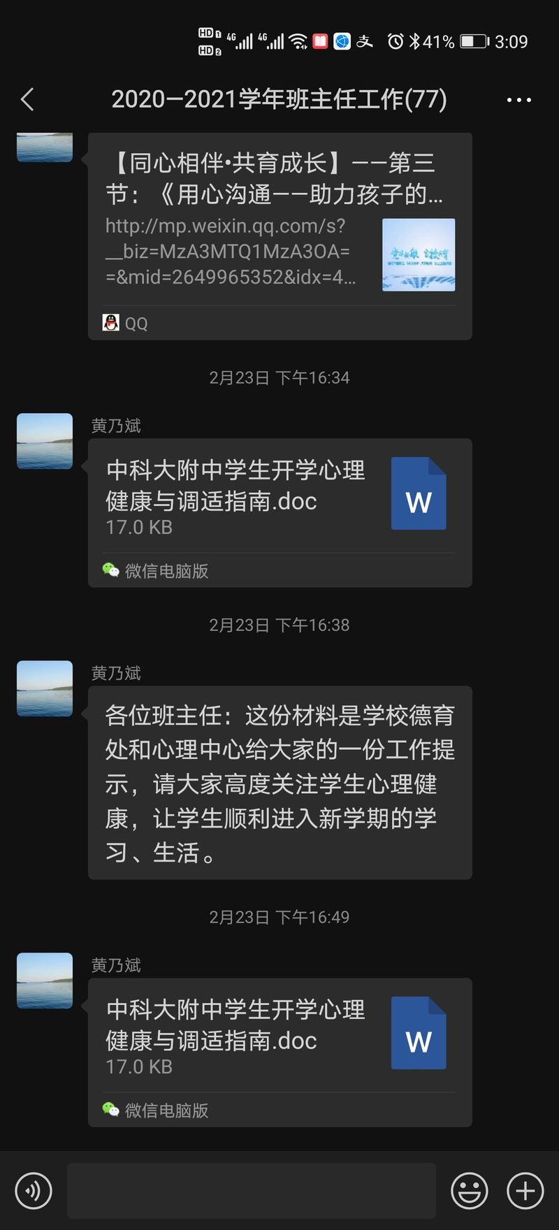 为帮助师生顺利适应新学期,以更积极、更健康的心态投入开学后的教育教学工作和校园学习生活,2月22日开学日下午,我校德育处心理咨询中心在全体教职工群、班主任群发布《中科大附中学生开学心理健康与调适指南》。该指南提示班主任与任课教师,大家在开学之际的课程教学中,除了关注教学与知识传递,一定要关注学生的情绪状态、学习心态、人际交往状态等心理健康状况。要在课堂教学中渗透生命教育,引导学生通过创设生活环境、调整作息、积极倾诉、主动适应、寻求学校专兼职心理教师帮助等方式来稳定自己的情绪。从而更好地帮助同学们快速适应新开始,以积极平和的心态迎接新学期的到来。