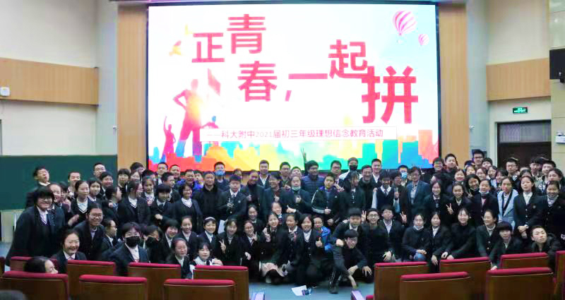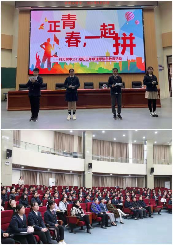 袅袅东风起,青春正当时。春之伊始,科大附中德育处和初三年级组在附中报告厅为全体初三同学举行了一次特别的“班会”——“正青春,一起拼”科大附中2021届初三年级理想信念教育活动。科大附中校长马运生,副校长张峻菡,校长助理黄严生,教务处、德育处负责人和全体初三师生参加了活动。