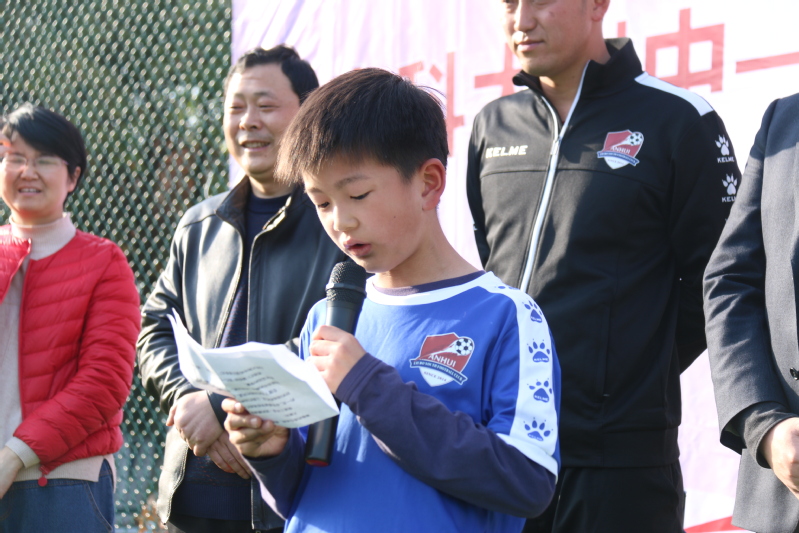 球员代表蔡继霄同学发言,他代表所有队员表达了对足球的热爱,以及坚持足球运动的决心,也向在场的家长们保证,会合理安排好足球运动和学业的时间,如他自己所说“我们会努力做一个会踢球的学霸”。