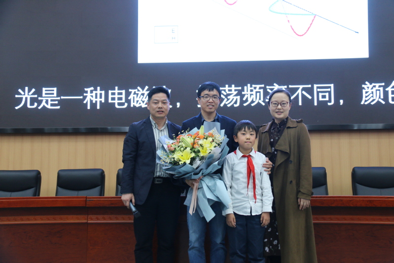 樊逢佳首先向同学们介绍了他的研究方向——发光量子点,那是尺寸在纳米量级,可以发出多彩光的小颗粒。他重点向同学们讲解了光是什么,并介绍了不同颜色光的本质区别,让同学们了解到光是一种电磁波,既有电场的振荡也有磁场的振荡。为了加深同学们的印象,讲座中还设置了互动环节,同学们用手臂来模拟电磁波的波动。樊逢佳通过让同学们改变手臂伸缩速度,让大家理解到不同颜色光的本质区别:蓝光波长短,震动频率较快;绿光波长稍长,震动频率稍慢;红光波长最长,振动频率最慢。最后他还和同学们分享了保护视力的小知识,提醒同学们要多晒太阳预防近视。生活中的光,原来是这般。同学们获益匪浅,散场后依然追问不停。