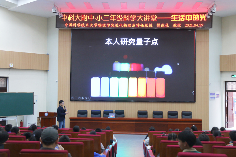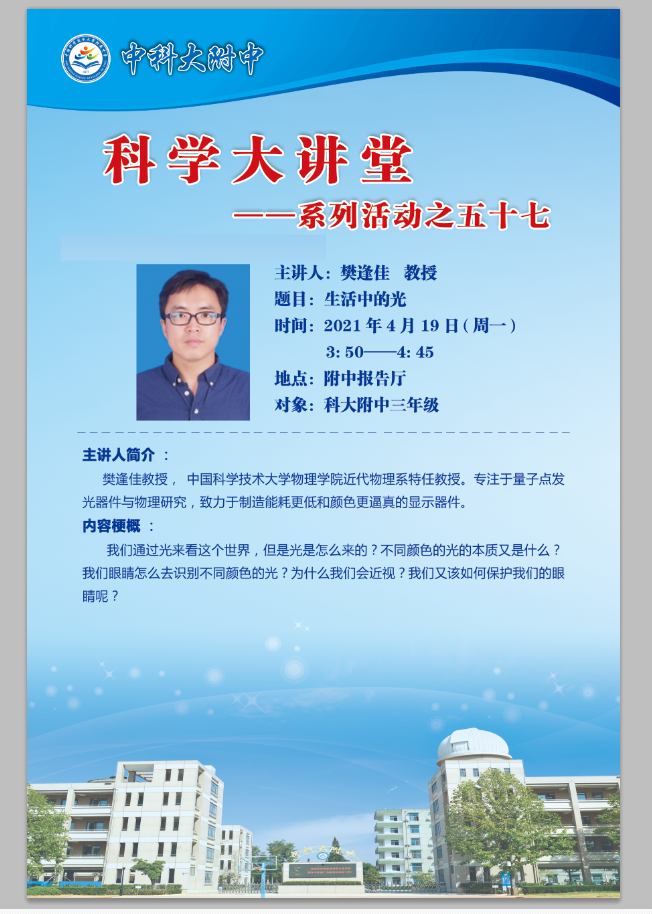 春光融融,和风煦暖, 4月19日下午,科大附中科学大讲堂第57期——《生活中的光》如期举行。本次活动特邀中国科学技术大学物理学院特聘教授樊逢佳主讲,活动由年级组长江贤民主持,三年级全体师生聆听了讲座。