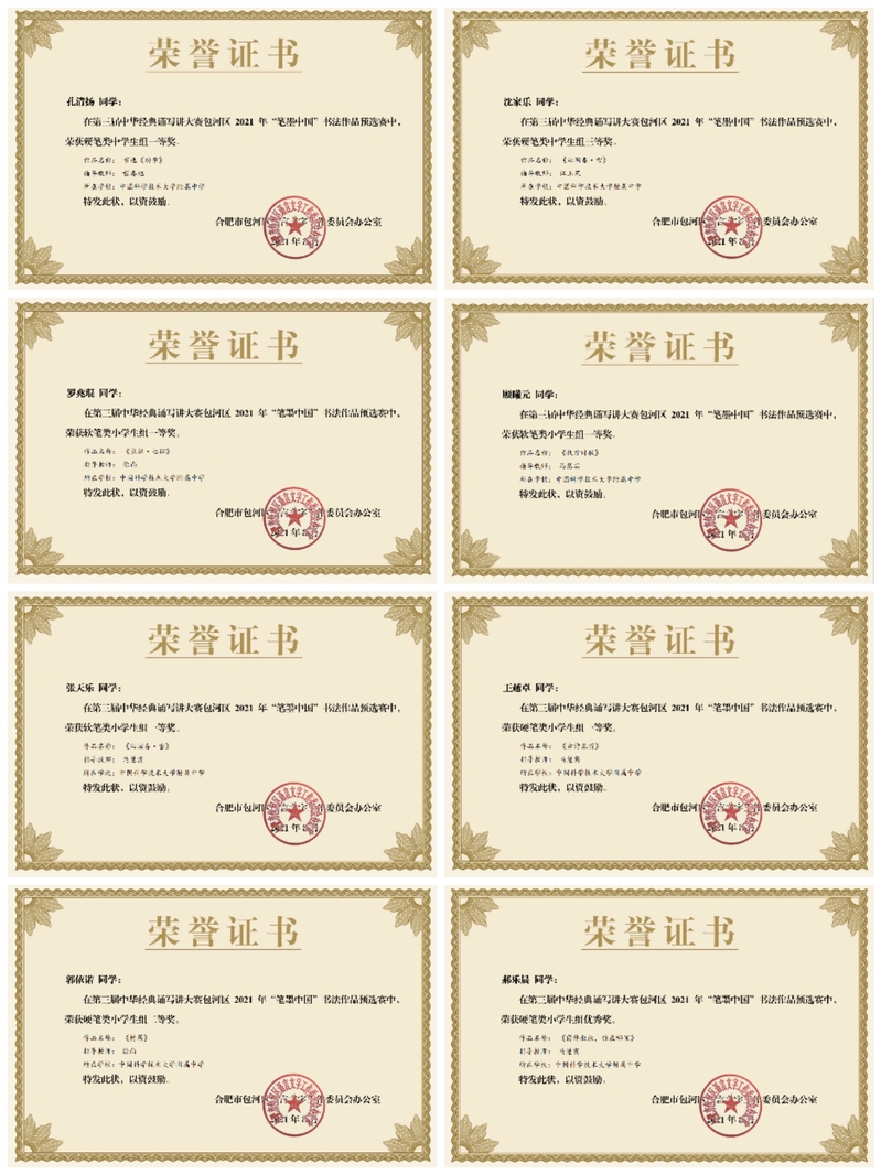在今年5月接到大赛通知后,美术组积极组织,精心筹备。在组内老师们的动员下,学生们踊跃报名参赛。参赛作品内容丰富、手法灵活多样,既有恣情挥毫的篆书,也有行云流水般的行书,还有娟秀工整的正楷。经过评委认真筛选后,最终选定17幅书法作品代表我校参加比赛。经过逐级评选,包河区初评赛中16幅作品获奖(其中一等奖9名) ;合肥市晋级赛中共10人获奖(其中一等奖7人、二等奖3人)。以下是区级获奖证书: