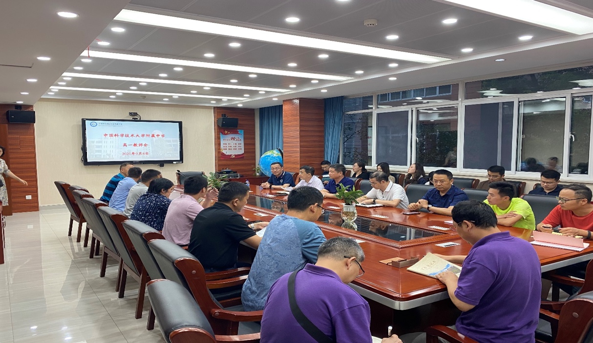 2021年9月8日下午6:00,科大附中在中学部二楼会议室召开高一年级全体教师会议。学校领导班子、各部门负责人及全体高一教师参加会议,会议由教务处副主任戈益超主持。