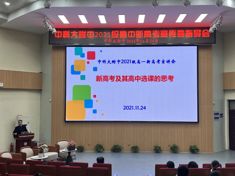 新高考,新机遇,新挑战。为进一步加强2021级高一学生对新高考政策的理解,促进学习方式转变。11月24日下午,中科大附中高一年级在报告厅举办新高考宣传暨指导会。会议由教务处副主任戈益超主讲,分管高中部副校长徐斌与会指导,全体高一学生参加。