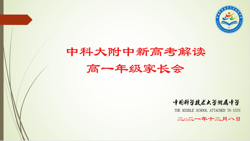 为促进家校联系,为新高考做好充分准备。12月8日下午,高一年级召开“新高考解读”家长会。中科大附中副校长徐斌,德育处主任黄乃斌、副主任朱永,教务处副主任戈益超,全体高一年级学生家长参加会议。会议由黄乃斌主持。