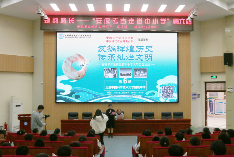 为了进一步向公众普及考古领域的科学知识,增进青少年群体的科学文化素养,12月8日,安徽商报联合安徽省文物考古研究所、合肥市教育局共同举办的“安徽考古走进合肥中小学”公益活动走进中国科学技术大学附属中学。活动邀请了安徽省文物考古研究所馆员蔡波涛作为主讲嘉宾,教研室主任束从武、团总支书记王飞、历史组全体老师以及初一年级学生参加讲座。本次活动由历史组李宏梅老师主持。