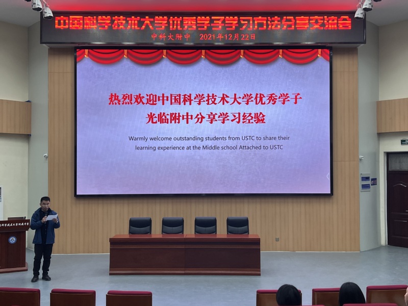 为帮助学生总结学习得失,改进学习方法,养成良好的学习习惯,12月22日下午,中科大附中邀请中国科学技术大学四位优秀大学生代表在学校报告厅作经验交流分享。高中分管副校长徐斌、团总支书记王飞以及高一年级全体学生参加此次活动。活动由团总支副书记张巨扬主持。