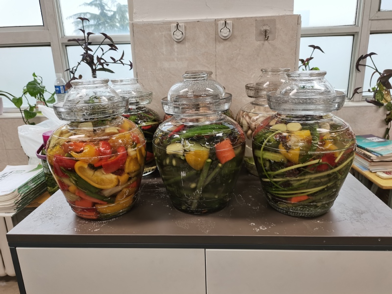 准备阶段,在生物组张巨扬、石彩玲等老师的指导下,同学们学习了传统发酵技术的相关知识,并学以致用,亲自选购菜品、去杂选优、精心制作,严格按照程序对处理过的菜品进行腌制。经过时间的沉淀,一坛坛咸酸可口、略带甜香的泡菜静静等待开封。