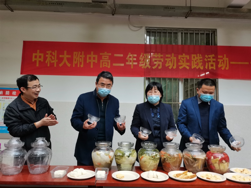 3月30日下午,活动第一环节是泡菜开坛。高二年级全体师生见证了这一收获时刻,副校长张峻菡,德育处主任黄乃斌、副主任朱永为泡菜开坛。在氤氲的香气中,同学们津津有味地品尝自己亲手制作的泡菜,喜悦之情溢于言表。活动吸引了路过的学校师生,不时有老师和其他年级同学加入品尝的行列。科大基础教育集团主任、中科大附中校长马运生,副主任徐磊也亲临现场,分享同学们劳动的快乐,让同学们备受鼓舞。