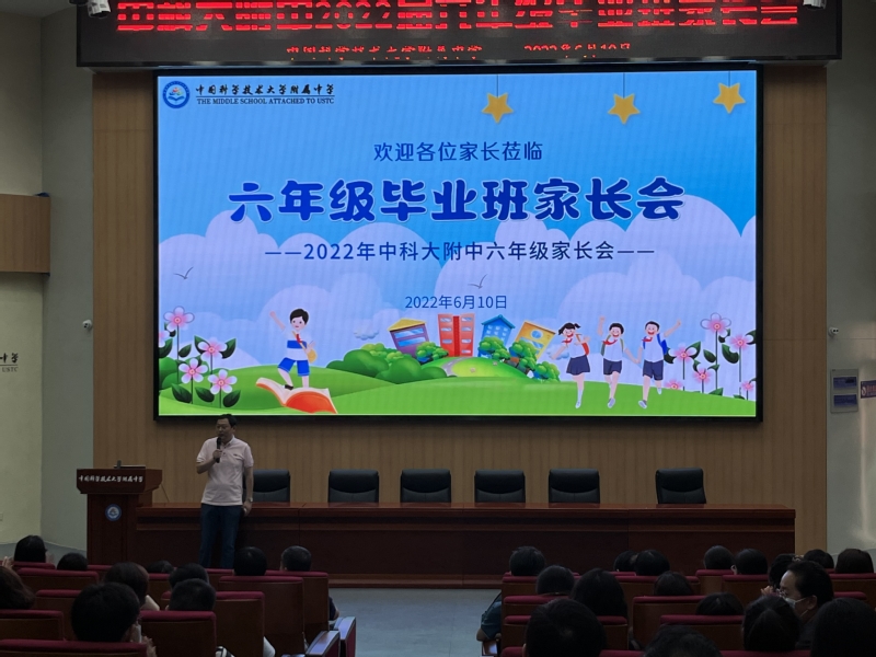 为进一步促进家校沟通,实现家校合力,关注孩子健康、快乐成长。6月10日下午,中科大附中六年级全体老师、家长齐聚学校报告厅,开展“家校携手,为小升初做好准备”为主题的2022届毕业班家长会。会议由教务处主任余国军主持。