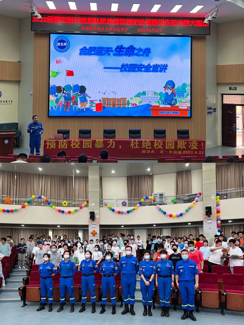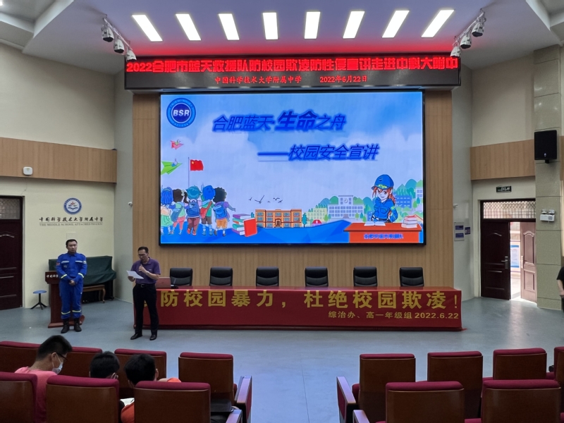 为了让法治走进校园,进一步增强学生法治意识,学会运用法律保护自己,预防校园暴力,杜绝校园欺凌,6月22日下午,中科大附中综治办邀请合肥蓝天救援队在报告厅为高一年级全体师生开展了以“预防校园暴力,杜绝校园欺凌”为主题的防校园欺凌防性侵宣讲进校园专题讲座活动。活动由综治办主任张兴连主持。
