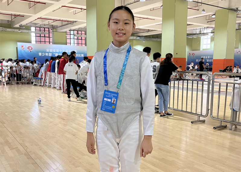 艾新翊萱同学她从小学阶段就开始练习击剑,多次获得过省内外奖项,这次经过合肥市选拔赛以第一名的成绩取得省运会参赛资格。在这次比赛中,既感受到胜利的喜悦,也体会到了落败的悲伤,积累了珍贵的经验。虽然在比赛中受伤,仍忍痛上阵,通过拼搏取得了小组第一的好成绩,但在单败中因过度紧张而略占下风造成比赛失利,后续极力调整,以一分之差输给对手,甚为惋惜。个人赛后自我反思,在团体赛发挥出真正的实力。作为团体主力,放下包袱,冷静上阵,看重过程,勇于尝试,最后终于站上最高领奖台,夺得女子重剑丙组团体冠军。