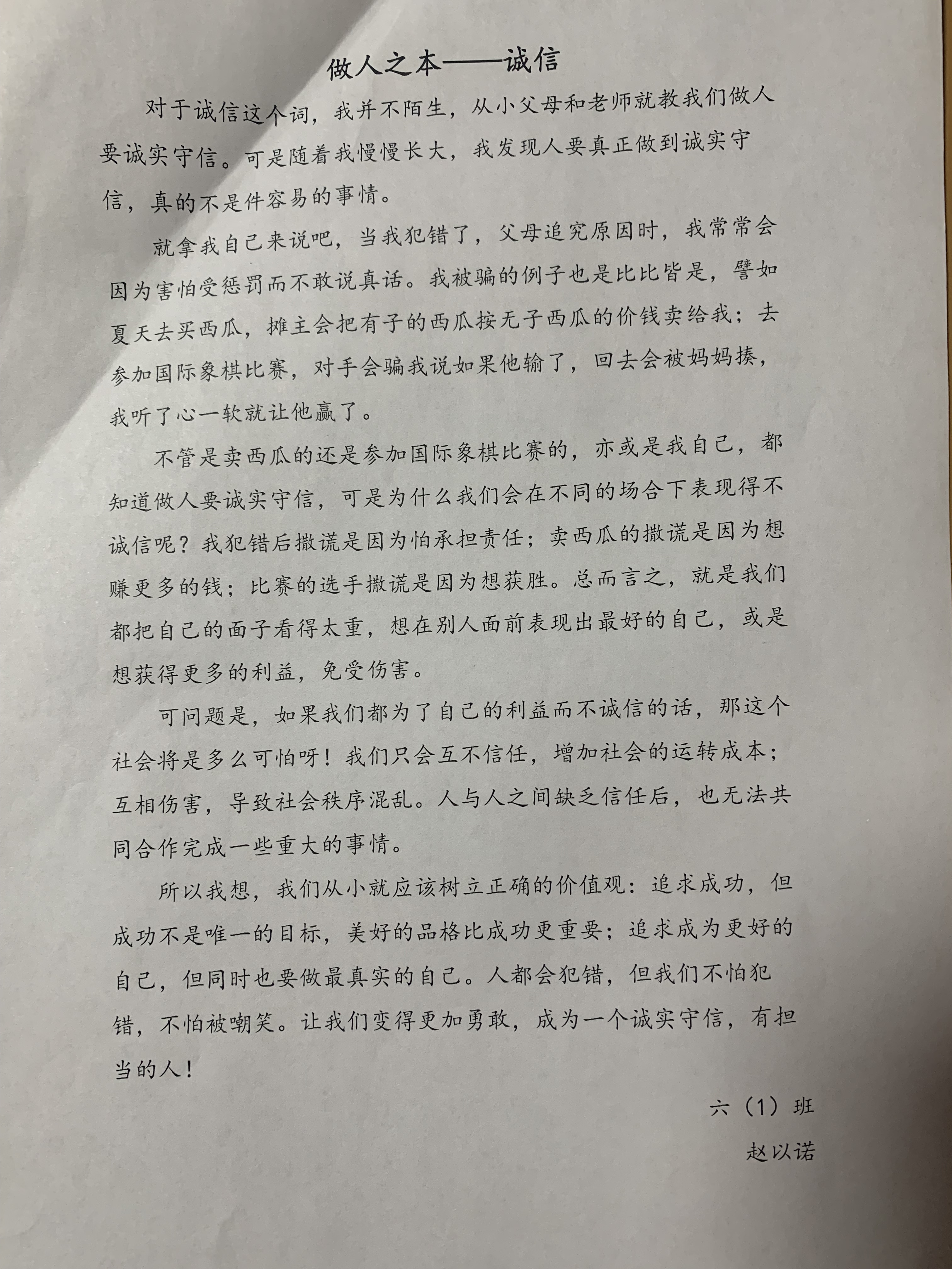 为增强学生诚信意识,促进诚信教育与社会主义核心价值观教育、学生日常行为规范教育、中华民族传统美德教育相融合,近日,中科大附中通过氛围营造、主题班队会、诚信主题绘画、征文比赛等形式开展了“诚信进校园”系列主题活动,让学生在潜移默化中时刻感受到诚信教育,把诚实守信准则内化于心、外化于行。