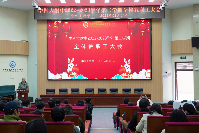 中科大附中党总支书记、校长汤胜回顾了过去一年的学校发展与工作成效,肯定了全体教职工的辛苦付出和辛勤耕耘。展望新学期,他从当前教育形势出发,特别强调教育教学工作首先要注重实效。开展工作要有思想、有举措、有目标、有成效、有宣传,做好理论与实践的融合,深入到学校发展和学生发展中去,不断反思、创新,将重点工作做实。其次学校发展要注重品质。附中办学要继续坚持教育品质,坚守教育底线,加强后程管理,在不断思考与行动中提升教学质量。同时,教育管理要提炼文化。要秉承附中的优势与办学特色,打造十二年一贯制教育的文化与品牌,构建健康和谐的教育生态,构建良好的师生关系,诚心关爱学生,真心欣赏学生,热心帮助学生。他希望全体教职工成为一个和谐团结、积极向上的集体,互相帮助、互相影响,助推学校持续发展。汤胜还就2022年度学校财务情况进行了说明。