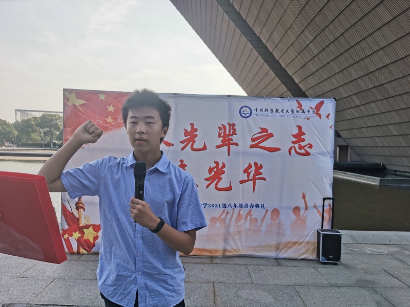 青春不停步,时代在召唤。青春礼活动随着中国少年先锋队队旗的缓缓入场拉开序幕。八年级全体同学立正敬礼,齐唱队歌。学生代表章叶青怀着赤诚之心表达新一代青少年对革命先辈的崇高敬意,对时代使命的担当。教师代表朱浩老师的谆谆话语饱含着殷切的希望。他呼吁同学们要珍惜青春年华,不负使命。王飞用热情洋溢的发言鼓励同学们从责任、感恩、奋斗三个方面奋发向上,做新时代有为青年!