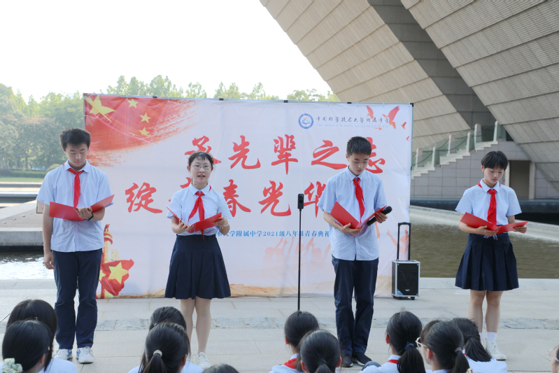 随着退旗曲的响起,同学们告别了少年先锋队队旗,也解下了胸前的红领巾,这标志着他们向崭新而火热的青春迈进。王皓哲同学带领八年级全体同学郑重许下青春誓言:“以青春之我,创建青春之家庭,青春之国家,青春之民族,青春之人类,青春之地球,青春之宇宙!”