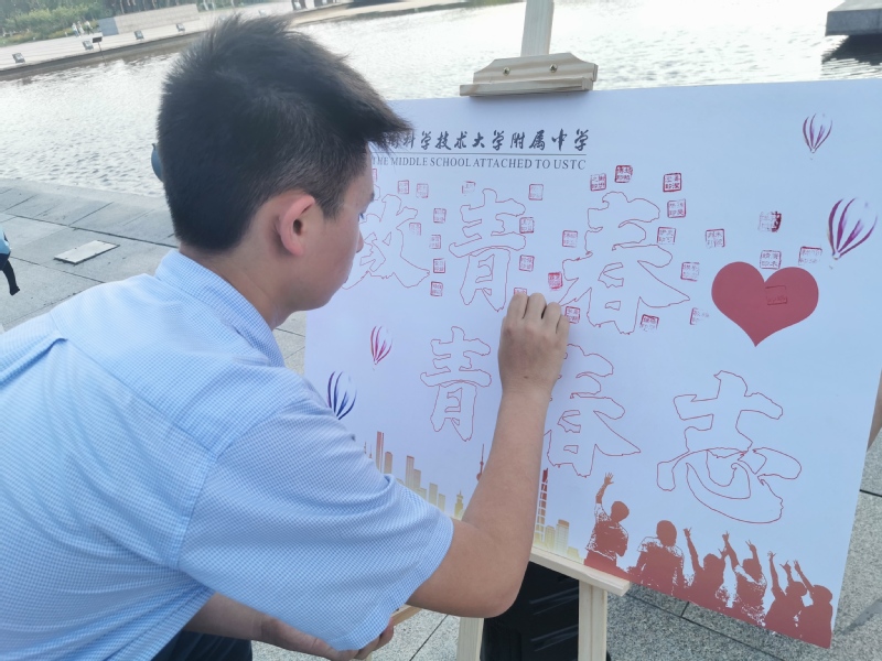 镌青春印记,待芳华绽放。活动最后,黄乃斌、朱永向同学们赠送了纪念品——青春印章。一枚枚鲜艳的红章印刻下一个个青春的名姓,也将拳拳爱国心、灼灼少年志留在了十四岁的夏天。以青春之志致敬青春,我们在路上。(八年级组 孙燕 汪凤 供稿)