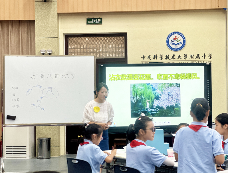 合肥市翠庭园小学黄静老师首先执教展示课《去有风的地方》,带领我校四(5)班学生一起“畅游”。黄老师从吃火锅到风的成因,从风级、风向到古诗词,彰显多学科融合的特色。