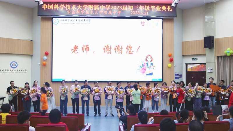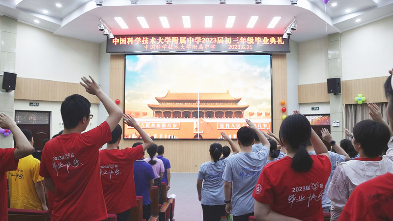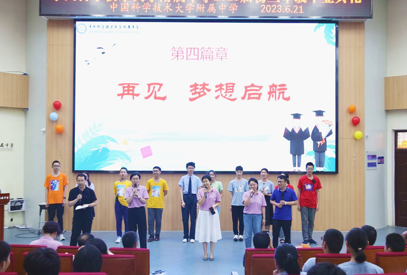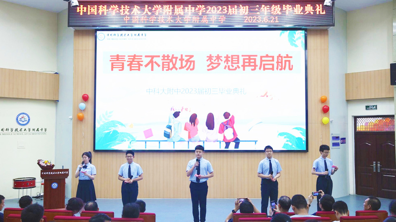 2023年6月21日上午,中科大附中2023届初三年级毕业典礼在报告厅隆重举行。学校领导班子及各职能部门负责人、全体初三师生出席典礼,苑曦和、宋宸宇、马弋岩、周振滔、许豫五位同学担任主持。