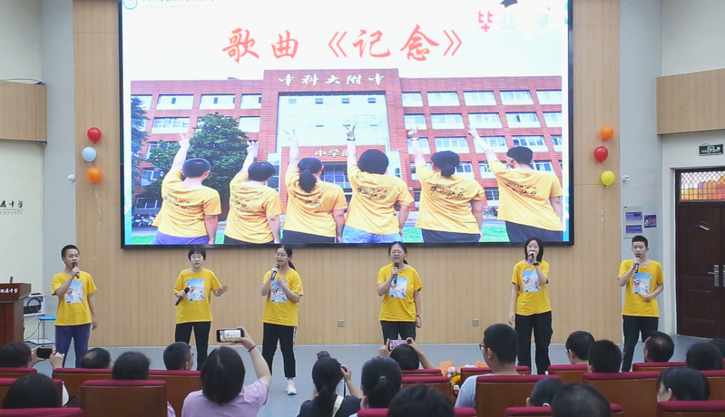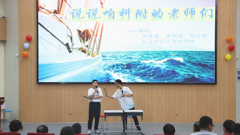 恰同学少年,风华正茂。在击鼓传花的游戏中,同学们大声表达出对附中校园环境、老师以及同学们的不舍之情。一班同学带来相声《夸夸咱附中的老师》,笑声中饱含学子对老师们的浓浓深情;二班、四班同学们的歌曲串烧带大家回望了那些一起走过的路,一起读过的书,一起看过的晨辉和夕阳,以及关于科附、关于成长的故事;三班的小品《老师看不见的地方》,从另一个角度展现了科附学子快乐的学习生活,重温了三年里欢乐的瞬间,拼出青春最美的模样;五班同学们的诗朗诵《六月话别》以长亭外、古道边的送别之景表达自己对科附的惜别之情。