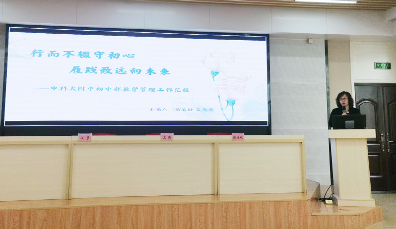 吴燕燕以“行而不辍守初心,履践致远向未来”为主题,汇报了我校初中部教学管理工作中的经验和做法。她向大家介绍了附中初中学段的师资、学生等概况,并在此基础上以“计划任务目标”为主线,重点阐述了我校七至九年级三年教学工作的整体规划和常态管理,分享了各项工作的经验做法。