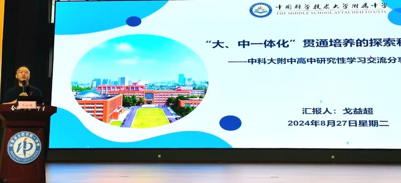 活动安排合肥一中、合肥七中和我校交流分享开展研究性学习的经验成果。戈益超向与会老师介绍了中科大附中在开展高中研究性学习中“大、中一体化”贯通培养的探索和实践。他在交流中着重介绍了我校将研究性学习纳入课程管理的做法,通过上届展示、下届观摩的方式进行引领式发展;依托中科大的丰富资源,通过瀚海计划、英才计划等平台,利用大学实验室等优质科研环境,激发学生开展研究性学习的兴趣,提升研究水平;注重过程管理,将研究性学习视作培养学生综合素养特别是创新能力的重要抓手,常态化、规范化地开展对研究性学习的选题、研究、指导、评比、展示等活动。自活动开展以来,我校报送的学生作品在合肥市普通高中研究性学习案例评比中获奖比例较高。