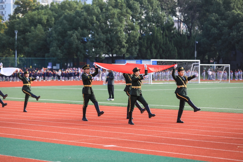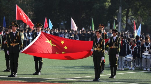 入场式之后,升旗仪式庄严举行。在雄壮的国歌声中,鲜艳的五星红旗冉冉升起,全场师生肃立敬礼,注视国旗,高唱国歌,满怀对祖国的热爱与自豪。