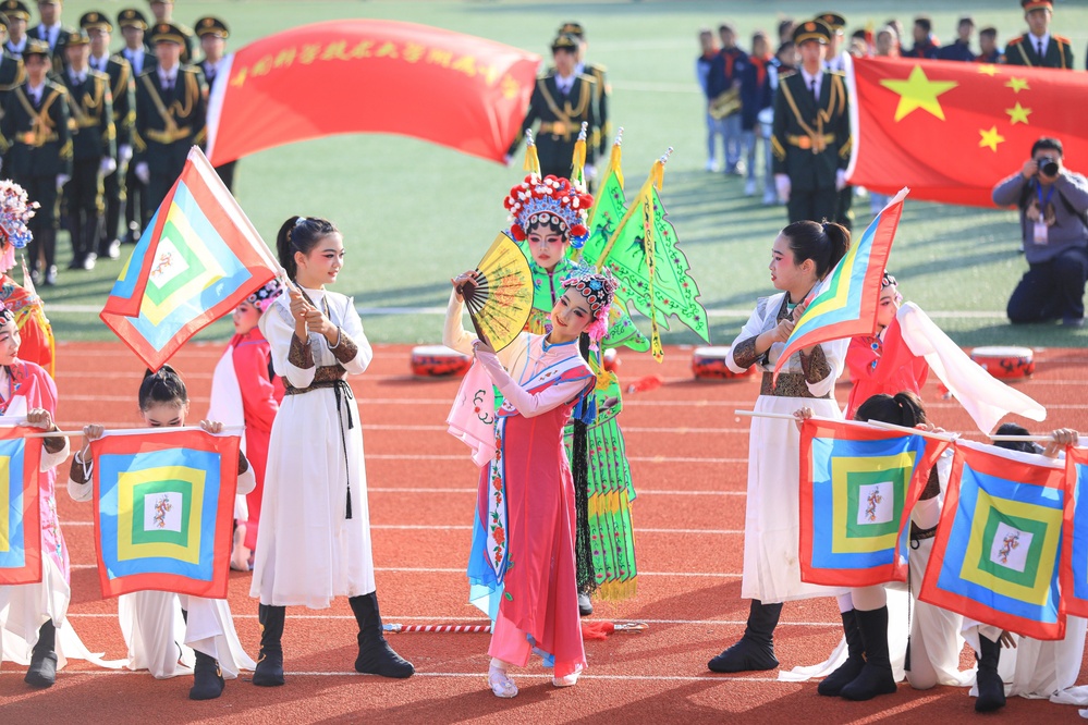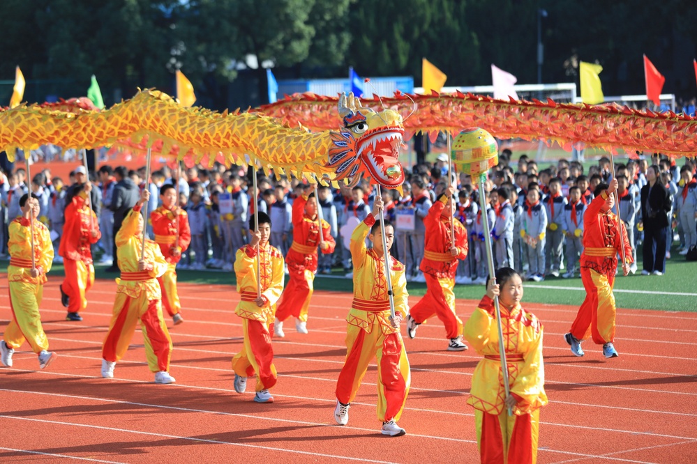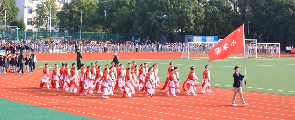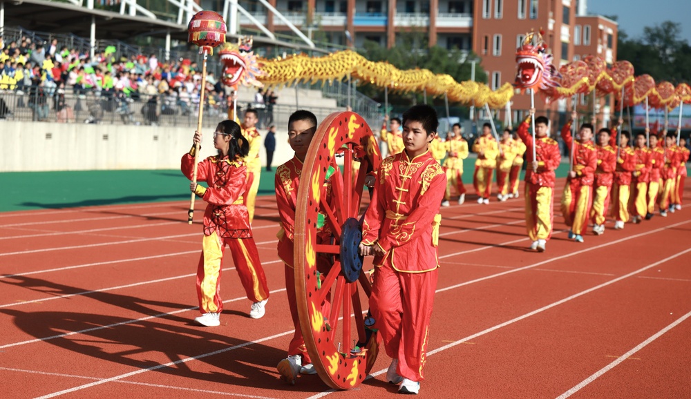 各年级的特色表演更是精彩纷呈:三年级的节目《天地龙鳞》以扇为笔,以舞为墨,书写着“强国有我”的铮铮誓言;四年级表演了代代相传的跳皮筋经典童谣——《马兰花开》,同学们配合默契,在快乐的节奏中跳出团结与活力;五年级的《武术操》精神抖擞,刚柔并济,一招一式、一拳一脚中展现中华武术的博大精深。六年级的戏曲表演《盛世年华》在多个经典选段中充分演绎了京剧丰富的表现手法和独特的艺术魅力。七年级的节目《龙腾轩辕·薪火相传》用人文始祖黄帝的“轩辕滚车”与象征民族活力的“舞龙”作为意象,传承文化之火,展现自信与担当。高二年级的《青春主打歌》以身为笔,以心为弦,在赛场的画卷上,镌刻下名为“我们”的青春篇章。每个节目都独具匠心,绚丽的色彩与灿烂的笑容交织成开幕式上最动人的风景。