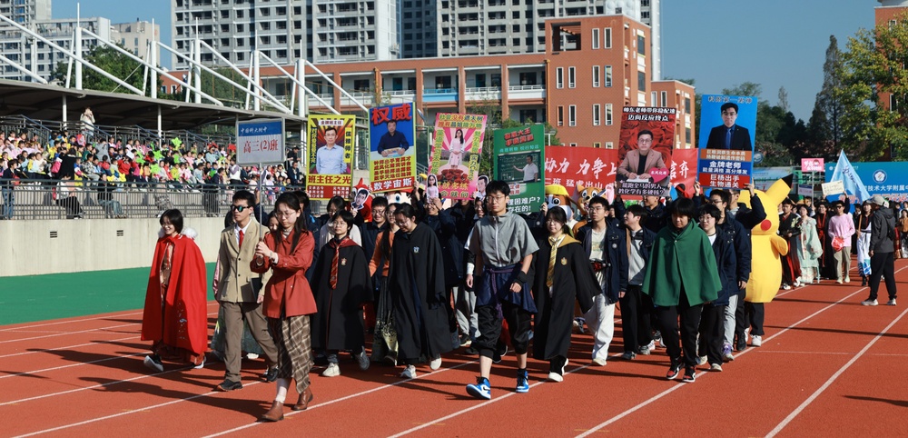 从小学三年级到高三年级,各班方阵步伐铿锵,整齐划一,尽显昂扬抖擞的精神风貌。看,他们手持各自的青春宣言,迎面而来:有的班级挥舞着鲜艳的五星红旗,赤子之心炽热如火;有的班级高擎励志横幅,手持花环与彩带,昂首阔步之间,自信与喜悦在每一张脸庞上熠熠生辉。更有班级或巧妙融合学科特色与科技元素,或以特色服饰展现文化传承,彰显出独特的班级个性与无尽的青春创造力。一张张朝气蓬勃的脸庞,一串串响彻云霄的口号,整个运动场汇聚成一片沸腾的海洋。