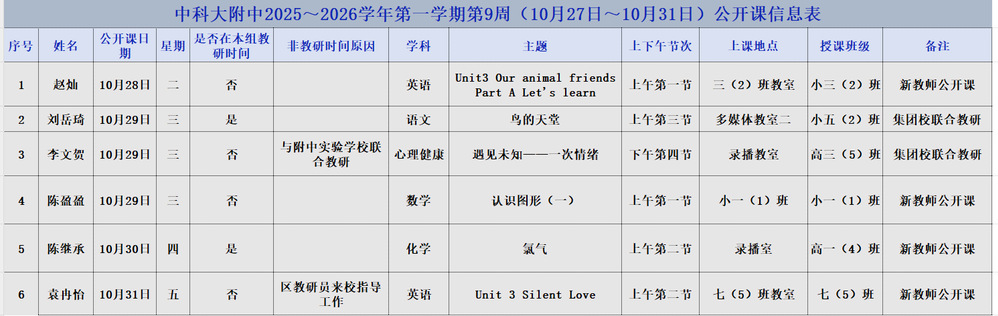 第9周(10月27日~10月31日)公开课信息表