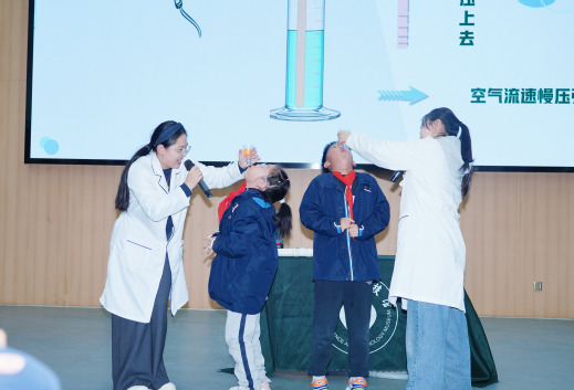 活动伊始,“看不见的推手”环节便迅速点燃了现场气氛,带领同学们踏入流体力学的奇妙世界。老师们手持吹风机与乒乓球,现场演示了“吹不散的乒乓球”实验——当气流穿过乒乓球下方时,原本会掉落的乒乓球竟稳稳悬浮在空中。“这就是伯努利原理的魔力!”老师讲解道,高速流动的空气会产生低压区,周围的高压空气便会形成“隐形推手”托住乒乓球。她进一步结合生活场景科普:高铁行驶时会带动周围空气快速流动,形成压力差,这就是为什么必须站在安全警戒线外的原因,避免被气压差‘推’向列车。生动的实验搭配贴近生活的解读,让同学们听得聚精会神,不时发出阵阵惊叹。