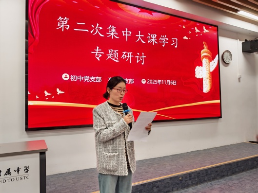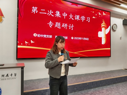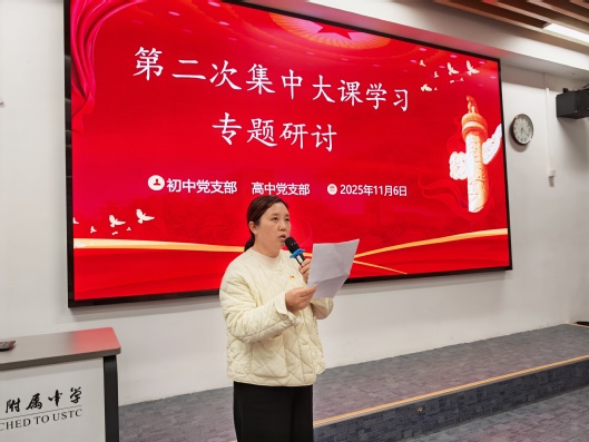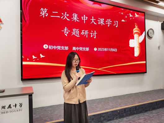 11月6日,中科大附中初中、高中党支部与中国科学技术大学第27届研究生支教队临时党支部,通过线上线下相结合的方式,联合开展第二次集中大课专题研讨活动。主会场设于附中高中部多媒体教室,宁夏海原设线上分会场,约百名党员参加。初中党支部书记程忠园主持会议。