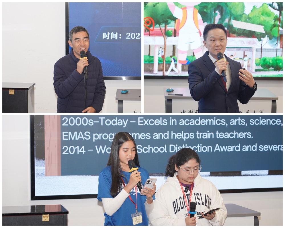 汤胜向武中师生阐释了我校“红专并进,理实交融”的校训内涵,介绍了附中的办学特色与学生校园生活,重点分享了我校在培养学生科创精神、实践能力以及传承中华优秀传统文化方面所做的探索,引发了新加坡师生的浓厚兴趣。薛哲禧校长在致辞中表达了到访中科大附中的欣喜之情,并对接下来的交流活动充满期待。武中两名学生代表以图文并茂的方式,生动介绍了新加坡的文化特色与学校历史。