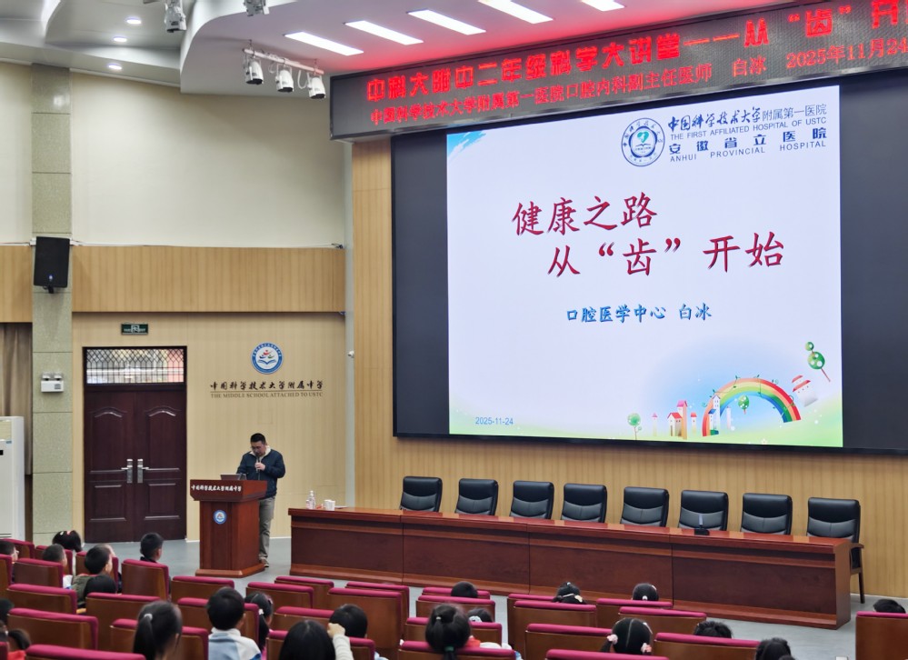 11月24日下午,我校“科学大讲堂”第116期活动在报告厅开展。活动特邀中国科学技术大学附属第一医院口腔医学中心副主任医师白冰,以“健康之路,从‘齿’开始”为主题,为二年级全体学生带来一场通俗易懂的口腔健康科普报告,带领同学们走进牙齿的奇妙世界,学习科学护牙知识。活动由张令洁老师主持。
