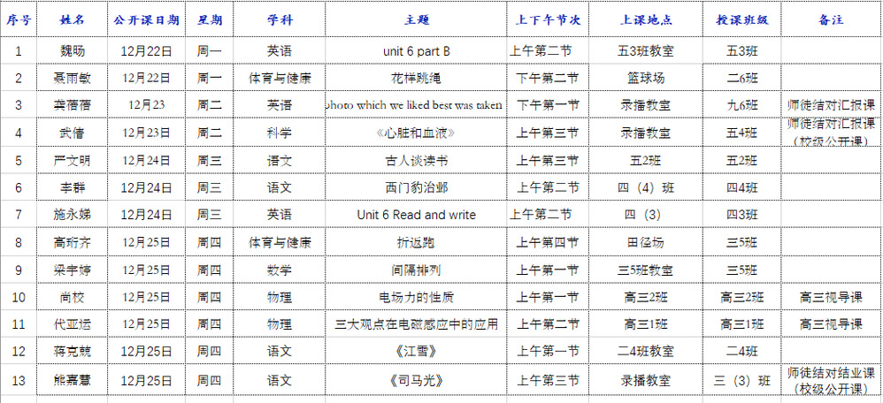 第17周(12月22日~12月26日)公开课信息表
