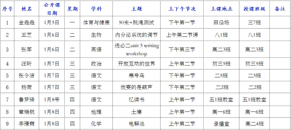 第19周(1月5日~1月9日)公开课信息表