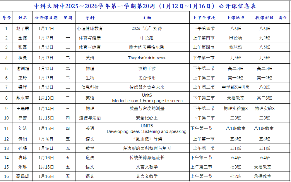 第20周(1月12日~1月16日)公开课信息表