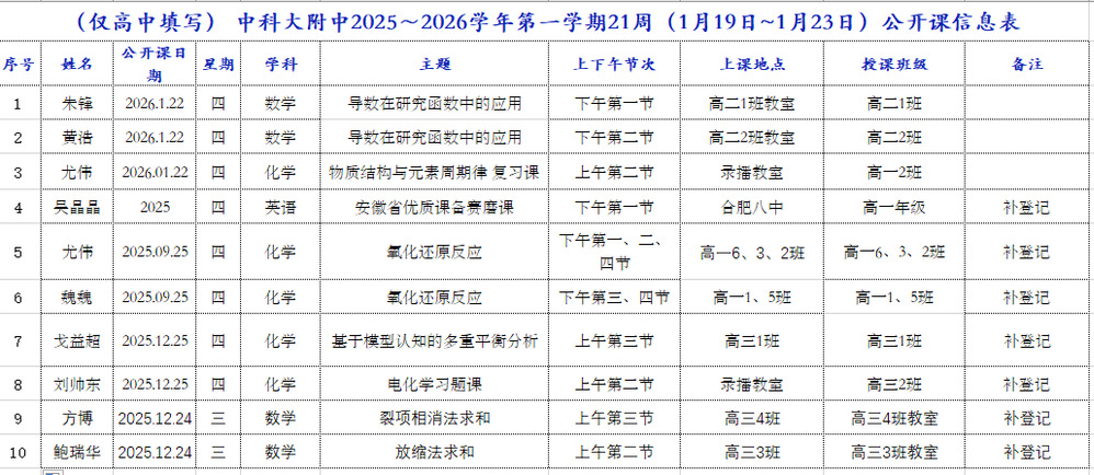(仅高中填写)中科大附中2025_2026学年第一学期第21周(1月19日_1月23日) 公开课信息表.xlsx