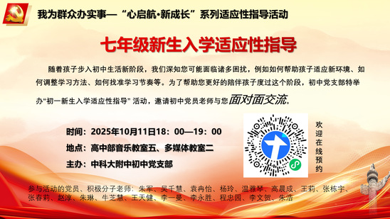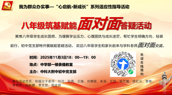 活动坚持需求导向,通过“线上问卷+班主任访谈”双线调研,全面梳理各年级家长和学生关注的核心问题,精准把握不同阶段的成长需求。针对七年级适应调整、八年级学业分化、九年级升学准备等阶段性特点,党支部提前与党员教师深入沟通,着力提供“一人一策”的个性化指导,既回应共性困惑,也确保与学生的成长节奏同频共振。