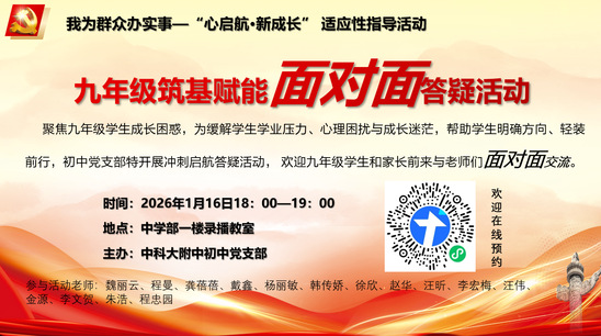 初中党支部将持续深化“心启航·新成长”品牌建设,密切关注学生与家长的实际需求,推动调研成果落地见效,将组织优势转化为育人实效,以高质量党建赋能教育实践,切实发挥党员教师在服务群众、践行使命中的先锋作用,为培养担当民族复兴大任的时代新人贡献基层党组织的坚实力量。
