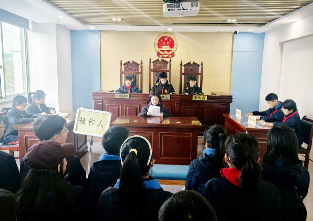 参观期间,模拟法庭活动同步开展。同学们分别扮演审判长、公诉人、辩护人等角色,围绕模拟偷盗罪案件展开审理。在完整的庭审流程中,学生们亲身体验诉讼程序的严密性,深刻理解法律的严谨与权威,将法治专册中“法律是行为准则”的知识内化于心,切实增强了对法律的敬畏之心。