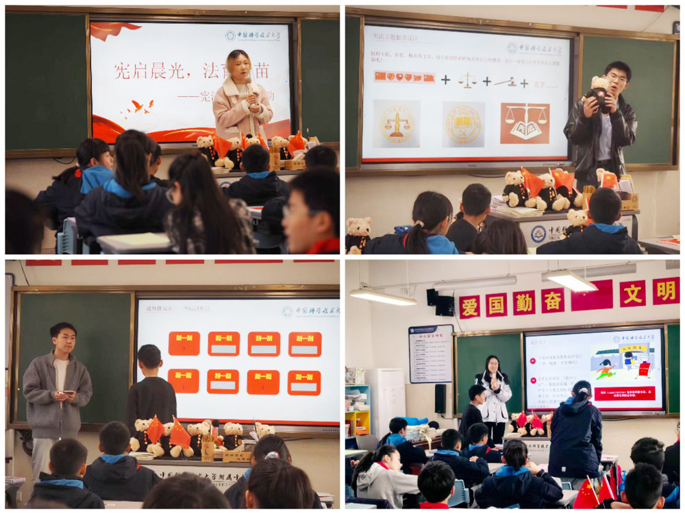 同日上午,大学学生会干部带着宪法宣传活动进入小学六年级。通过宪法小课堂、互动问答、“宪法在身边”分享会等环节,让学生在轻松氛围中系统巩固教材法律知识,深化宪法认知。在徽章设计和创意书签制作环节,学生们巧妙融合国旗、天平、书本、显微镜等元素,写下“宪法护我成长,法治伴我求知”“学教材知法,守宪法做人”“学法懂法,做合格科苗” 等心声,在动手实践中强化法治身份认同与责任意识。