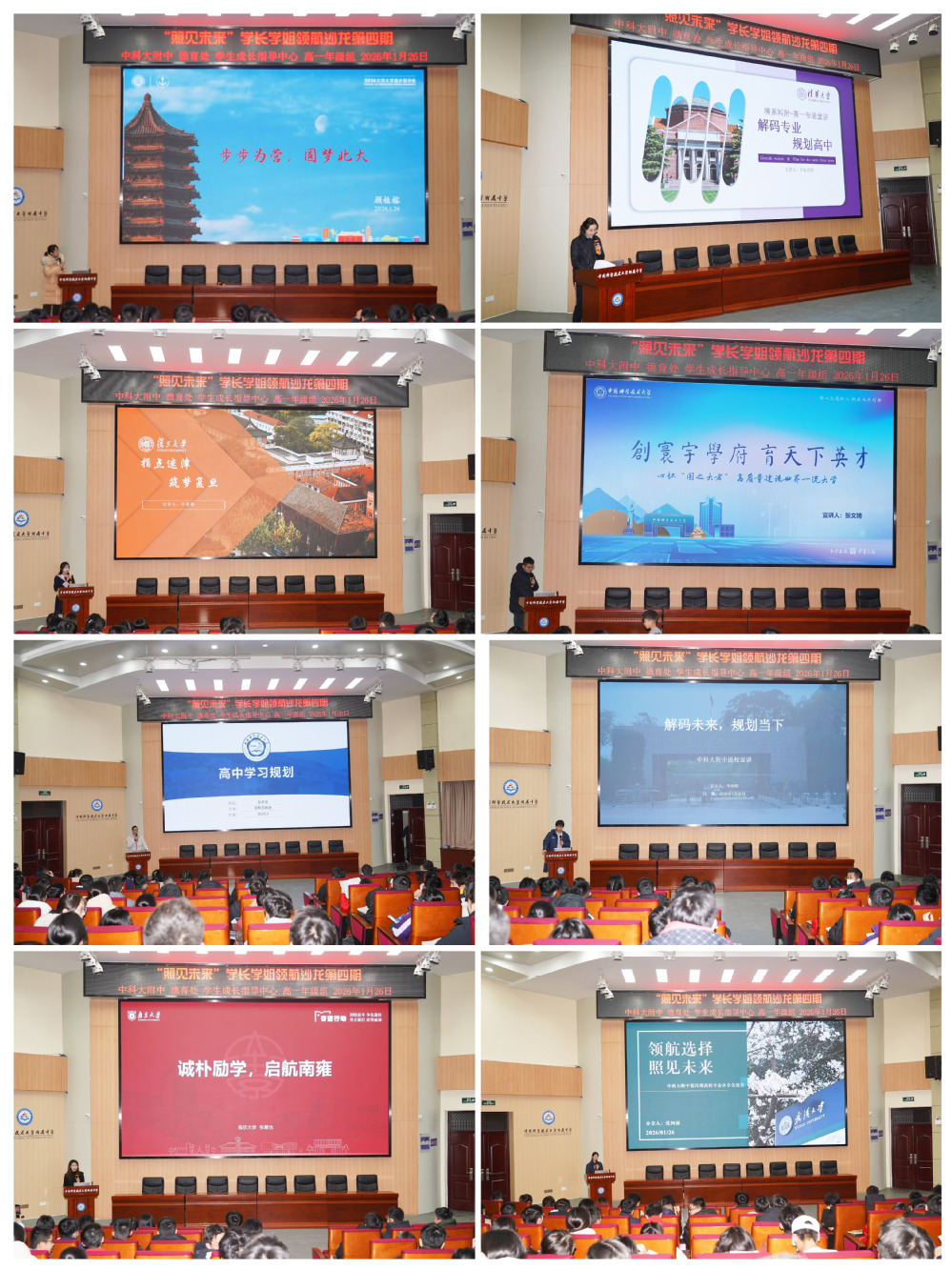 随后,来自北京大学、清华大学、中国科学技术大学、复旦大学、南京大学、武汉大学的8位优秀毕业生依次登台,结合自身求学经历与大学生活感悟,为学弟学妹们带来了一场干货满满的成长分享。