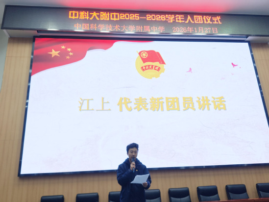 新团员代表江上发言。他分享了成为团员的激动心情,表示将以团员的标准严格要求自己,勤奋学习、积极进取,在学习和生活中发挥模范带头作用,不辜负团组织的信任与期望。老团员代表范澄聚则向新团员们送上祝福,鼓励大家牢记入团初心,传承共青团的优良传统,在青春的赛道上奋力奔跑,书写属于新时代青年的精彩篇章。